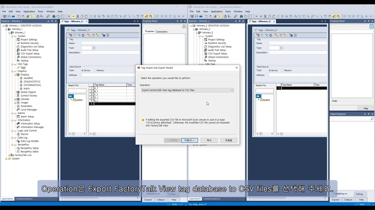데이터 추출(Export): 'Tag Import and Export Wizard'를 통해 프로젝트 내 모든 태그를 CSV 파일로 저장합니다. 이 과정에서 ME(Machine Edition)와 SE(Site Edition) 형식을 선택할 수 있습니다.