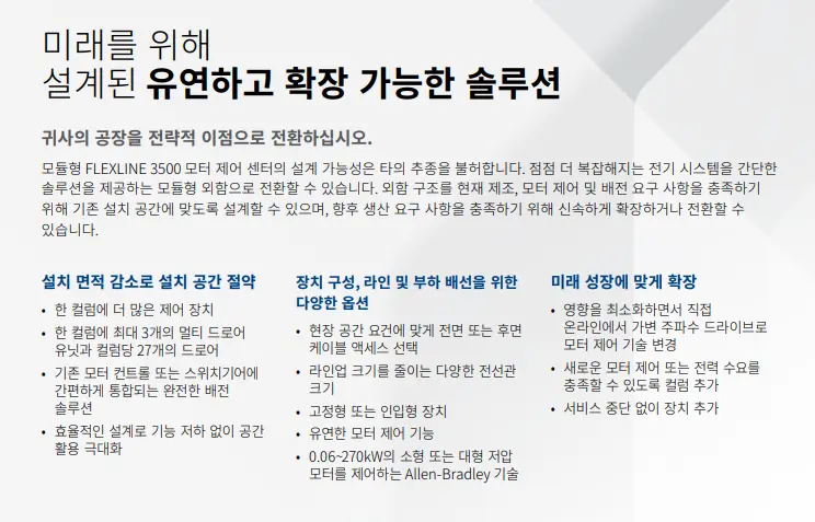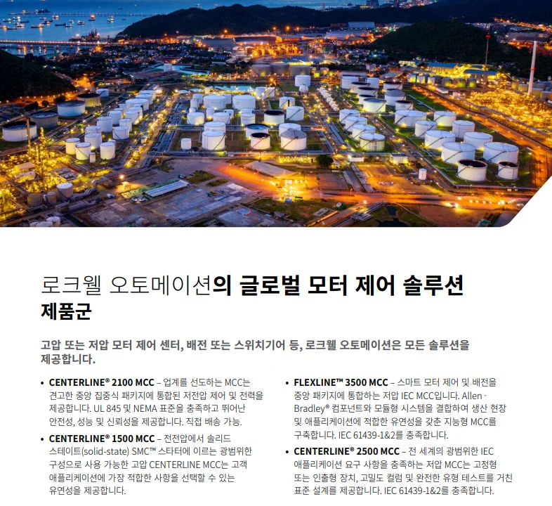 이 제품은 중앙 집중식 패키지 안에서 확장성과 지능형 모터 제어 기능을 모두 제공하며, 제조 효율, 자산 가용성, 신뢰성을 향상시키는데 최적화되어 있습니다.