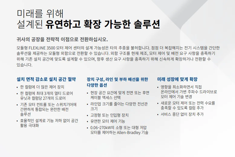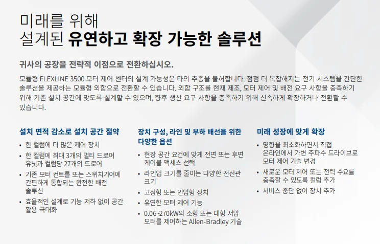 산업 환경은 빠르게 변화하고 있으며, 제조 공정에서 요구되는 효율성·유연성·안전성의 기준은 점점 높아지고 있습니다. 이러한 변화에 대응하기 위해 출시된 FLEXLINE™ 3500 저압 MCC는 스마트 모터 제어를 위한 최신 기술과 모듈형 설계를 결합한 차세대 솔루션입니다.