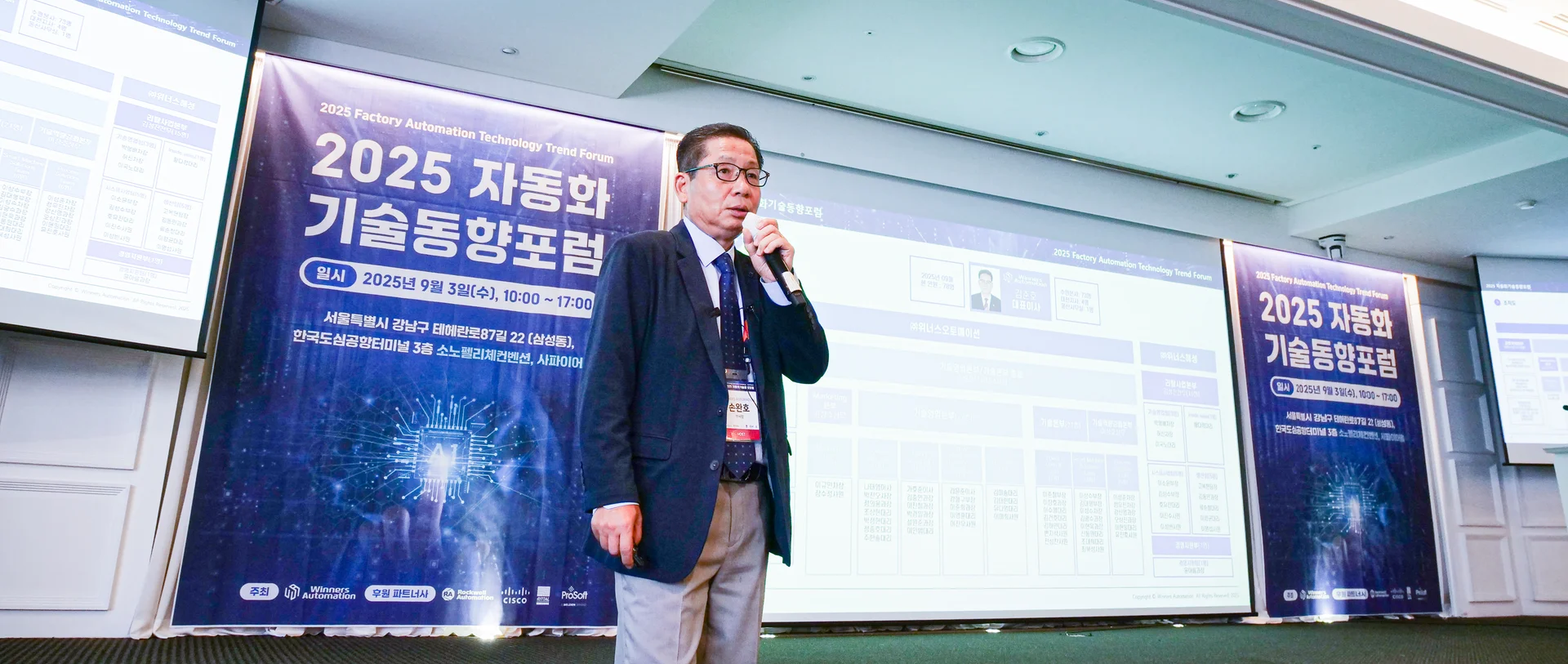 행사는 환영사로 시작하여, 위너스오토메이션 사업 소개와 함께 다양한 기조연설이 이어졌습니다.